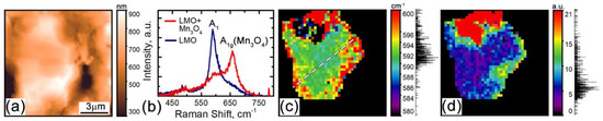 As the first step, a number of LiMn2O4 particles were inspected with complimentary AFM and confocal Raman microscopy. The measurements were conducted at different spots across the cathode sample. An AFM topography image of a typical particle is presented in Figure 1a. According to our previous studies, a few peaks of the Raman spectrum can be used to determine the lithiathion state and phase composition of LMO [32]. At a nominal composition Li0.61Mn2O4, Raman spectra consist of 5 peaks: 310 cm−1, 490 cm−1, and 630 cm−1 related to the F2 lattice vibrational modes and peaks at 565 cm−1 and 592 cm−1 related to the A1 modes [32]. Details of the Raman spectra are discussed in [32]. Here, to construct confocal Raman maps, the A1 peak at 592 ± 4 cm−1, which indicates the local lithiation state, was used (Figure 1b) as well as the peak at 660 ± 3 cm−1 associated with the A1g mode of Mn3O4 (Figure 1b). A higher value of the Raman shift of the A1 peak of LMO corresponds to a higher lithiation degree. From the map in Figure 1c, it is evident that the lithiation degree gradually increases towards the grain boundaries, while the center of the particle is slightly less lithiated. At the same time, the strong A1g peak at 660 cm−1 is indicative of the Mn3O4 phase. The Mn3O4 phase was observed mainly in the vicinity of the particle-binder interface, where it forms distinct clusters (Figure 1d). This behavior is expected due to the Mn dissolution in the electrolyte during cycling (the cathodes were cycled 3 times before delithiation) and supposed to be a key factor of the electrode capacity degradation [36].