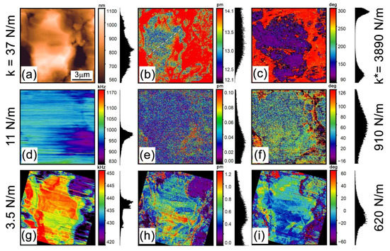 Probe tip displacements in the electromechanical (EM) SPM measurements were determined following the method described in [34,35]. Calibration of the probe tip displacements was made based on the quasi-static force-distance curves. The actual on-resonance values of the cantilever bending in the DART mode were determined from the measured amplitudes following Gannepalli et al. [33]. The obtained values were divided by the corresponding quality factor of the contact resonance and the resonance mode shape factor [34]. The shape factor and contact stiffness were calculated using a home-made MATLAB program (2018a, MathWorks, Natick, MA, USA) based on the measured contact and free resonance frequency values according to procedure described in [34,35]. Parameters of the probes as well as determined contact stiffness and shape factors are summarized in Appendix A (Table A1). The resonance frequency of the first flexural contact mode for the 3.5 N/m probe was determined using the ESM response, while for the 11 N/m and 37 N/m probes, auxiliary piezo-transducer-induced sample vibrations were used to excite the probe oscillations and to measure the contact resonance peaks.