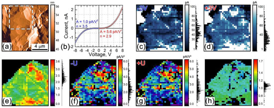 Analysis of local I−V curves and electric current distribution across the active ionic particle. (a) Differential topography (deflection error signal). The dashed line shows the 5.5 μm × 5.5 μm area where the I−V curve mapping was performed. (b) Typical I−V curve (circles) with a fit by Equation (4) (solid line). (c) Current distribution map for Vdc = −3 V. (d) Current distribution map for Vdc = +3 V. Maps of parameters A and n found by fitting local I−V curves by Equation (4): (e) n, (f) A−, (g) A+, (h) A+/A−. Black areas in (e–h) are regions inside the binder that do not show the typical I−V curve shape. For the images in (c–h), corresponding signal histograms are displayed on the right from the color scalebars.