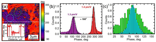The ESM phase signal in the area with the segregated Mn3O4 phase is slightly noisier (compare the areas indicated in Figure 4a by circles). This fact is validated by different widths of the signal histograms displayed in Figure 4c for the indicated areas of the image. To interpret this observation, we note that Mn3O4 is expected to have a lower Li diffusion coefficient in comparison to LMO [36]. However, a careful analysis of the Raman spectra allows us to identify the LMO peaks even in the areas with the Mn3O4 segregation (Figure 1b). The corresponding shift of the A1g peak around 660 cm−1 in clusters containing Mn3O4 was 1–2 cm−1 greater, which may be associated with an enhanced lithiation degree of LMO in these areas. Thus, enhancement of the ESM signal in the area with the Mn3O4 phase can be attributed to the presence of the LMO phase with a higher lithiation. The enhancement of the noise is, therefore, due to mixing of electrochemically active and non-active phases.