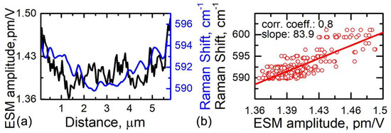 Correlation analysis of confocal Raman microscopy and ESM data. (a) Overlapped image profiles along the corresponding lines indicated in Figure 1c (Raman shift) and Figure 2b (ESM amplitude). (b) Circles: experimental A1 Raman peak shift versus ESM amplitude for a number of line profiles similar to those shown in (a); solid line: linear fit for the experimental data points.