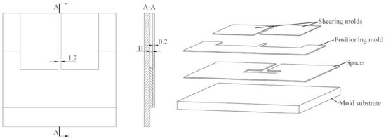 Figure 2, the primary combined rectangular shearing mold comprises four adjustable components that include positioning mold, shearing mold, spacer, and mold substrate. The positioning mold was used to limit shearing mold movement and determine the width between two shearing edges of two shearing molds. The thickness of the shearing mold was 0.2 mm, which is stiff enough to meet the requirement. The width between the two shearing edges of the two shearing molds is 1.7 mm. H represents the thickness of the spacer at Stage 2; the spacer in Stage 3 was decided by the spacer in Stage 2, which was 200 μm thicker than the spacer at Stage 2. The spaces in the middle of the spacers were sufficiently large to accommodate foil deformation. The mold substrate was used to limit the vertical deformation of foils.