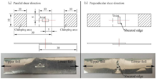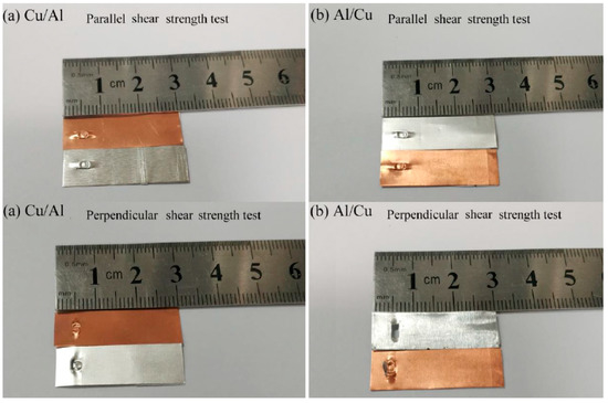 Figure 29. These joints have different appearances although they were formed under process parameters. The size and “Lock” of the upper foil formation of the Al/Cu joint were larger than those of the Cu/Al joint. The main drawing actions concentrate on the upper foil, and the lower foil was first sheared with drawing and necking actions because the upper foil was not in direct contact with the shearing mold. Caused by lower plasticity and greater strength of Cu foil than Al foil, Cu foil had less formation than Al foil under the same process parameters. Therefore, under the same process parameters, the upper Al foil can still exhibit sufficient drawing and shearing formation and acquire a large joint size and “Lock” when Cu foil was employed as the lower foil. However, minimal parts of Cu foil undergo sufficient formation when it is employed as the upper foil, thus reducing the joint size and “Lock”. The parallel and perpendicular shear strength of the two kinds of joints are presented in