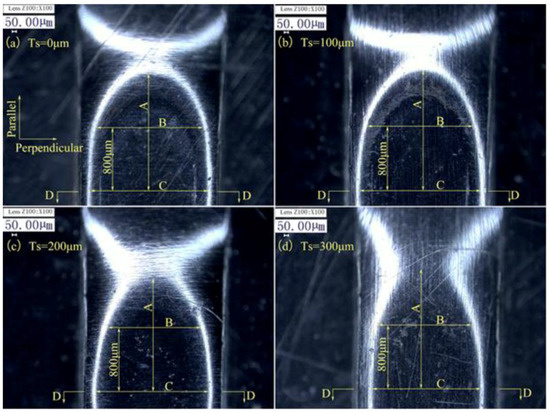 Figure 4, C is the dimension of the joint on the perpendicular symmetry plane that was perpendicular to the sheared edge; B is the dimension of the joint on the plane that was 800 μm away from the perpendicular symmetry plane; A is the dimension of the joint on the parallel symmetry plane which was parallel to the sheared edge; D–D is the cross-section on the perpendicular symmetry plane. The half preliminary joint was measured from the lower foil side, as shown in