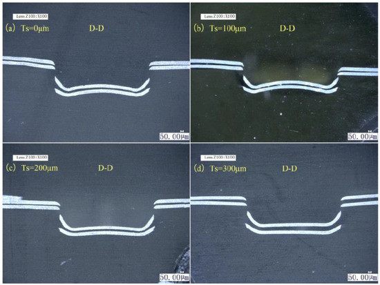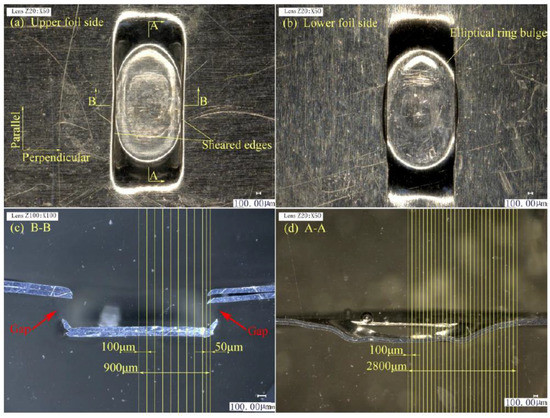 Figure 5, upper and lower foils were subject to drawing and shearing actions. The 100 μm soft punch produced the greatest spring back, and when soft punch thickness increases from 100 μm to 300 μm, the spring back gradually diminished and even disappeared. Increased joint formation and intensive spring back are produced by increased shockwave pressure synchronously. The results for the D–D section show that all of the four kinds of soft punches can successfully cause sheared parts to separate from raw foils. Moreover, spring back can be vastly reduced by the subsequent flattening action.