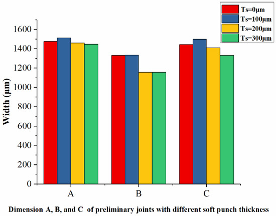 Figure 6 show that when soft punch thickness is increased from 100 to 300 μm, the formation area of preliminary joint narrows and the three dimensions gradually decrease. The maximum joint formation in Dimension A was obtained under a soft punch thickness of 100 μm. The second-highest joint formation was produced under a soft punch thickness of 0 μm (without soft punch). The joint formation in Dimension B under the soft punch thickness of 100 μm was slightly greater than that under the soft punch thickness of 0 μm. The joint formations with the two other soft punch thicknesses were similar and considerably smaller than those with the former two soft punch thicknesses. The soft punch thickness of 100 μm also produced the maximum joint formation in Dimension C. The trend shown by the joint formation in Dimension C was the same as that shown by the joint formation in Dimension A. This finding shows that the soft punch thickness of 100 μm can optimize the use of each laser pulse to maximize deformation. Wang et al. [