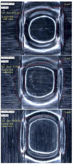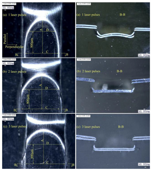 Therefore, two laser pulses on the upper foil side can induce the sufficient joint formation and ensure process efficiency. In the process, laser energy of determined laser pulses can be adjusted to meet different deformation requirements of different materials. Then, the experiments of the number of laser pulses on the lower foil side were conducted.