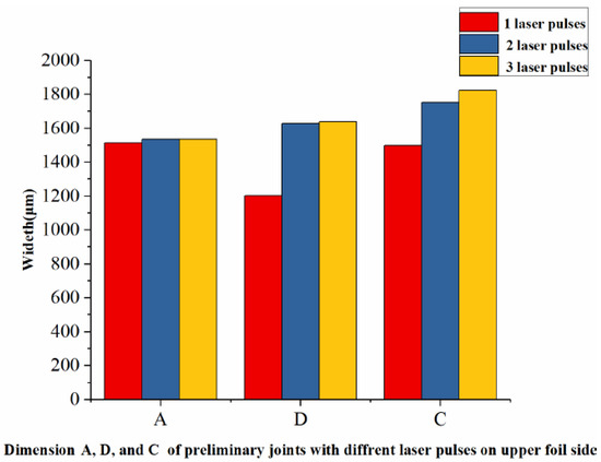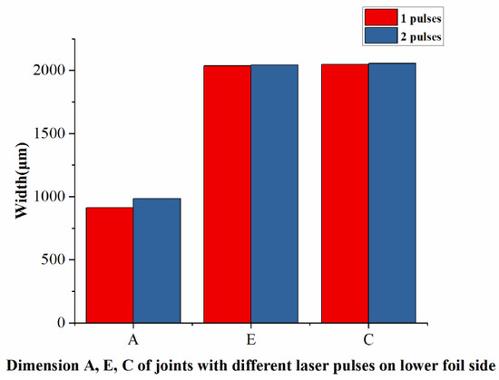 Figure 10 show that the two kinds of laser pulses enable joining. Moreover, the extent of joint formation under two laser pulses on the lower foil was greater than that under one pulse. Joint formation in Dimension A under two laser pulses was greater than that under one laser pulse. For Dimensions E and C, the joint formation under two laser pulses and on laser pulse were similar. The results show that the increase in the laser pulses on the lower foil side from one to two had a greater effect on formation along the parallel direction rather than perpendicular direction of the joint when the laser energy was small. In the perpendicular direction, the first laser pulse had already re-struck and flattened the sheared part on the raw foils. The second laser pulse simply provides the flattening action, which had a limited effect on the improvement in formation because of the reduction in energy. However, in the parallel direction after the first laser shock, the sheared part still needed to be re-struck and flattened. Thus, formation in the parallel direction was more sensitive than that in the perpendicular direction. The results shows that the second laser pulse had a limited improvement for the Dimensions E and C. Because the formation is sensitive to the increase in laser pulses owing to the small laser energy, and two laser pulses bring limited improvement, one laser pulse on the lower foil side is suitable for the process. The formation improvement can also be achieved by increasing laser energy instead of laser pulses. In