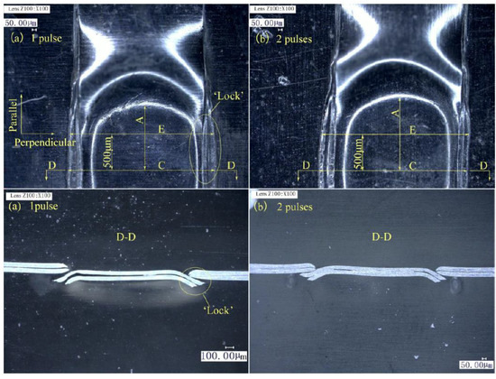 Figure 9, The D–D section reflects the formation of “Lock” on the perpendicular symmetry plane. The two kinds of laser pulses all successfully completed the joining.