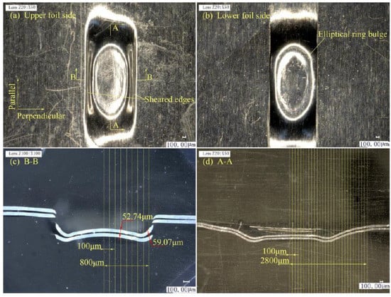 Figure 16a, in the A–A section, the thickness difference shown by the joint center was larger than shown by the joint edge. However, in the B–B section, the thickness difference was noticeable only at the edge. Overall, the thickness of the upper foil was larger than that of the lower foil. Because the upper foil was sheared after the lower foil was sheared, which caused more tensile stress in upper foil.