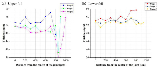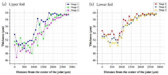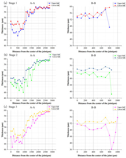 Figure 14b, the thickness evolution of the lower foil negligibly differed across the three stages in contrast to that of the upper foil shown in
