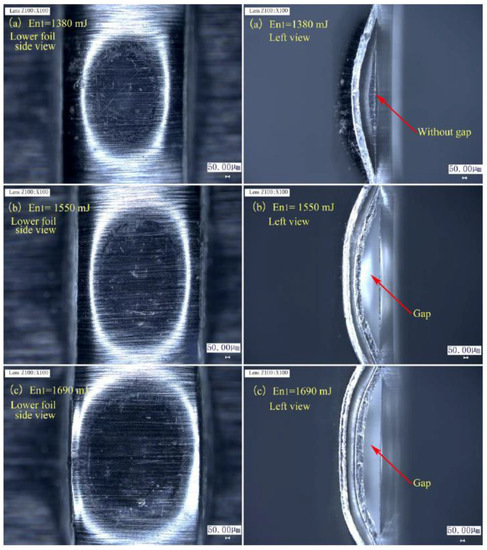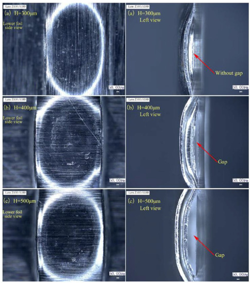 Figure 18, an insufficient and asymmetrical formation was produced in the lower foil under an H of 300 μm despite the employment of high laser energy. However, the H of 400 and 500 μm produces the sufficient and asymmetrical formation of preliminary joints because when the spacer is sufficiently thick, the considerable plastic deformation presented by metal foils can reduce or offset the misalignment and non-uniformity of the metal foils. From the left view of three joints in