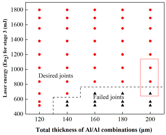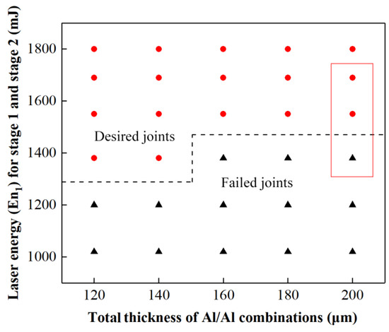 Figure 17 was acquired by studying preliminary joints formed in Stage 2. The desired joint part shows that the drawing and shearing actions for preliminary joint with certain H values are feasible for acquiring the final joint. The failed joint part indicates that certain qualified preliminary joints cannot be formed under certain H values even if the optimal laser energy is used. The results illustrate that spacer thickness H must be at least twice the total thickness. Moreover, when high H values are employed for thin combinations, joining with increased deformation and without ruptures is achieved because of free deformation along the length of the combined mold and the good plasticity of Al foils. The preliminary joints of 100/100 μm produced by different spacers with H values of 300, 400, and 500 μm and En