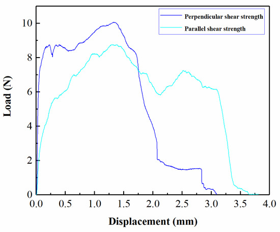 Figure 3 presents the dimensions and two shear directions of the single-lap shearing test sample. All samples were tested using an electronic universal testing machine (Instron Type UTM 4104, Shenzhen, China). The test was conducted at room temperature with a constant speed of 2 mm/s.