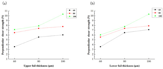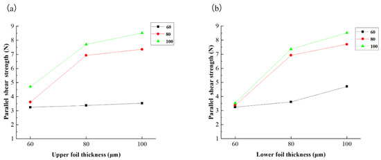 Figure 24a, when the lower foil thickness is 60 μm and the upper foil thickness increases from 60 μm to 100 μm, parallel shear strength does not drastically increase because in the parallel shear test, the sheared port of the lower foil provides resistance that easily reaches the upper limit and restrains the maximum point. Strength increases with the increase in upper foil thickness when the lower foil thickness is 80 μm or 100 μm. The resistance between the two foils accordingly increases because the lower foil is sufficiently strong to resist the upper foil. As illustrated in