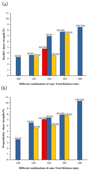 The parallel and perpendicular shear strengths of different combinations with the same Total thicknesses are presented in
