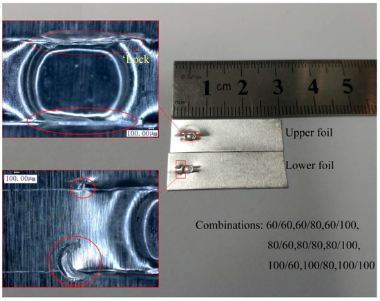Table 2. The other parameters are listed in the corresponding research section. Two types of metal foils were employed in the investigation. The foils included 1060 pure aluminum foil (Al), and pure pure T2 copper foil (Cu); “Al/Cu” indicates that the Al foil is the upper foil and Cu foil the lower foil; “100/60 μm” indicates that the thickness of the upper foil is 100 μm and the thickness of lower foil is 60 μm.
