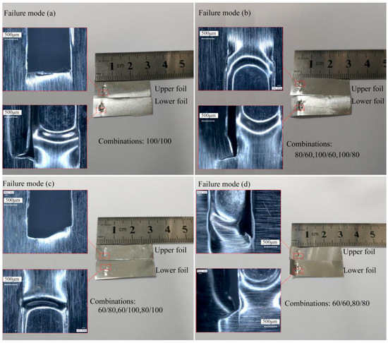 Figure 28, four kinds of failure modes are observed in the perpendicular shear test. During the test, the resistance force originates from the sheared part of the upper foil in contact with the raw part of the lower foil. In failure mode (a), the sheared part of the upper foil was completely sheared off, and the lower foil was pulled out of the cracks. Only the 100/100 μm combination undergoes this failure mode. The sheared part of the upper foil was completely sheared by the raw part of the lower foil despite having been strengthened. In failure mode (b), the sheared part of the upper foil appeared intact without noticeable deformation damage. However, the lower foil was pulled out of the cracks and exhibited bending deformation. Combinations with thick upper foils and thin lower foils undergo failure mode (b) because the raw material and work hardness increase the strength of the contact part of upper foil to levels higher than that of the lower foil. In failure mode (c), the sheared part of the upper foil was completely sheared off. However, the lower foil was intact. This mode was presented by combinations with thin upper foils and thick lower foils and contradicts failure mode (b), because although the work hardness of the raw part of the lower foil was less than that of the upper foil, the contact part of the lower foil was stronger than the upper foil as a result of differences in thickness. In failure mode (d), the upper and lower foils were pulled out of the cracks. The 60/60 and 80/80 μm combinations exhibited this mode because two foils with similar thicknesses cause similar resistance deformation. Comparing failure mode (a) with (d) reveals that the upper and lower foils have different failure modes despite having similar thicknesses. This observation shows that the lower foil in failure mode (d) produced significant bending deformation. However, the lower foil in failure mode (a) remained flat. The difference between these two modes may be attributed to a certain degree of dislocation of the shear forces on the two foils that occurs because of the special test sample structure during the shear process. The lower foil with a thickness of 100 μm was sufficiently strong to resist this dislocation force. Lower foils with a thicknesses of less than 100 μm bend because of dislocation force. Bending deformation also occurs in the sheared part of the upper foil undergoing failure mode (d) for the same reason.