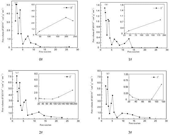 Figure 2 shows pore size distribution of the crumb rubber with different percentages of H2O2 respectively. It can be seen that the pore size distribution of rubber powder is more complex, and the pore size distribution is mainly concentrated in the range of 1.73–237.40 nm, with a peak value in the range of pore sizes less than 15 nm. The first peak value of the pore volume appears at a pore size of approximately 2 nm for all four samples, and the second peak value appears at a pore size in the range of 3 to 4 nm. In the range of 5 to 15 nm, the pore size distribution curve of the 0# sample only shows a peak at approximately 7.5 nm, while the other three samples show two peaks but the peak values are relatively small. The pore size of 0# and 1# samples begin to increase when the pore size is larger than 25 nm, and the pore size of the 2# and 3# samples begin to increase when the pore size is larger than 80 nm, while the critical value of the pore size growth is greater than that of the 0# and 1# sample. All samples exhibit the largest peak values in the range of 2 to 4 nm over the entire pore size distribution range, indicating that the pore proportion of the crumb rubber is the largest in the pore size range of 2 to 4 nm.