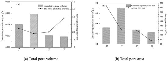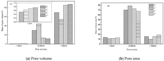 Figure 4 shows the cumulative pore volume and cumulative pore surface area of the crumb rubber after different ratios of H2O2 activation. It can be observed that the cumulative pore volume and cumulative pore surface area of the 1# crumb rubber sample are the largest. For the sample of 1# to 3#, with the increase in the percentage of H2O2 solution, the cumulative pore volume and cumulative pore area of the crumb rubber gradually decrease. Compared with the 0# unmodified crumb rubber, when the mass ratio of H2O2 is 0.5, the cumulative pore volume and cumulative pore surface area of the crumb rubber significantly increase. When the mass ratio of H2O2 is 1.0 and 1.5, the cumulative pore volume and cumulative pore surface area of the crumb rubber decrease. It can be observed from Figure 3a that the most probable pore size of the crumb rubber first decreases and then increases with increasing mass ratio of H2O2. When the mass ratio of H2O2 is 0.5, the most probable pore size of the crumb rubber is the smallest. When the mass ratio of H2O2 is 1.5, the most probable pore size of the crumb rubber is the largest. As depicted in Figure 3b, the 0# crumb rubber has a maximum pore size of 227.17 Å (1 Å = 1 × 10−10 m). With the increase in the H2O2 mass ratio, the pore size of the crumb rubber decreases gradually. When the mass ratio of H2O2 is 1.5, the crumb rubber has a minimum pore size of 74.14 Å. The pore size of the crumb rubber significantly decreases after being activated by H2O2.