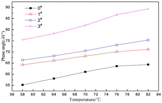 The phase angle δ represents the ratio of the viscous component to the elastic component in the asphalt. The larger δ indicates a smaller asphalt elasticity. Figure 5 shows the δ of the rubber asphalt prepared by different proportions of H2O2 activated crumb rubber. It can be seen that the δ increases gradually with the increase of temperature, indicating that the elasticity decreases. At the same temperature, δ increases with increase in H2O2 content, indicating that the crumb rubber activated with the H2O2 solution reduces the elasticity of the ACRM asphalt. A greater proportion of H2O2 results in a larger decrease in elasticity of ACRM asphalt. The minimum value of 3# asphalt is larger than the maximum value of the other three asphalts, indicating that it will significantly reduce the elasticity of the ACRM asphalt with H2O2 activated crumb rubber, with a mass ratio of 1.5.