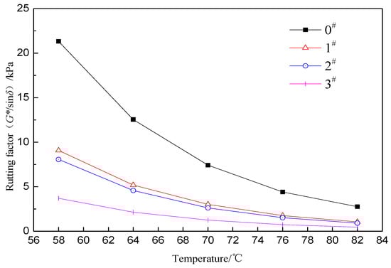 The failure temperature, for which G*/sinδ less than 1.0 kPa, is often used to determine the performance grade of an asphalt [33]. The test results are shown in Figure 7, which illustrate that the ACRM asphalt failure temperatures are greater than 70 °C, and the 0# ACRM asphalt has the highest failure temperature, while the 3# ACRM asphalt has the lowest. Although the rutting resistance ability of the ACRM asphalt decreased after crumb rubber activated by H2O2, the failure temperature (the testing temperature when G*/sinδ is 1.0 kPa) of the 3# sample with the largest reduction still reached 75.32 °C. This shows that the ACRM asphalt prepared by the crumb rubber, activated by H2O2 solution, exhibits good high temperature resistance to rutting deformation.
