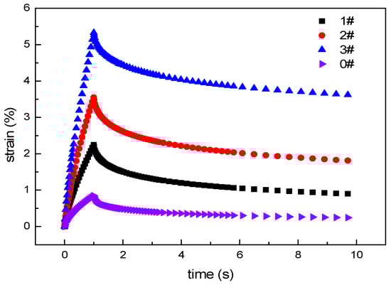 To better evaluate the recovery performance of rubber modified asphalt under loading [34], the creep recovery test is conducted, with a loading stress of 30 Pa, loading time of 1 s, unloading time of 9 s, and a testing temperature of 60 °C.