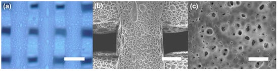 (a) Optical microscopic image of the porous PCL scaffold. (b,c) Top-view SEM image of the porous PCL scaffold. Scale bars: 500 μm (a), 200 μm (b) and 10 μm (c).