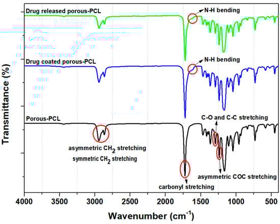 Structural characterization of the porous PCL scaffold, the drug-coated porous PCL scaffold, and the drug-released porous PCL scaffold were carried out by Fourier Transform Infrared Spectroscopy (FT-IR) using a Bruker (VERTEX 80 & 80v) FT-IR spectrometer equipped with a vacuum (Billerica, MA USA). The spectra were recorded at ambient temperature between 400 and 4000 cm−1.