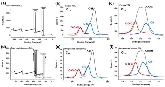 X-ray photoelectron spectroscopy spectra of the porous PCL (a–c) and drug-coated porous PCL scaffold (d–f).