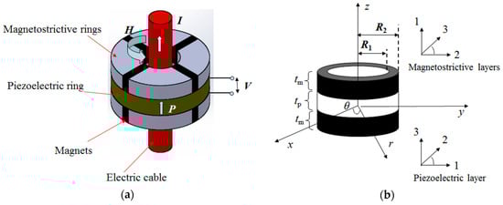 Figure 1a illustrates the structure of the ME laminate ring made of a piezoelectric ring sandwiched by two magnetostrictive rings. The magnetostrictive rings are composites of magnetostrictive materials and magnets (used to provide magnetic bias for magnetostriction). The application of a magnetic field by a flow of AC current I through the electric cable as shown in Figure 1 will induce a circumferential strain in the magnetostrictive materials that will be subsequently transferred to the piezoelectric material (with polarization along z direction) to produce electrical voltage. This process is the principle underlying the ME mechanism in the ME laminate composites. By the conventional modeling method, it is possible to establish the differential governing equation to describe the ME coupling process in the ME laminate ring. Figure 1b shows the physical model of the laminate ring. The cylinder coordinate system () was used in the modeling process and is shown in Figure 1b. It is noteworthy that the basic assumptions for the model included the following: (1) The magnetostrictive rings were assumed to be homogeneous materials; (2) The deformation mode of the ring is axisymmetric; (3) The bonding between the magnetostrictive and piezoelectric ring is excellent.