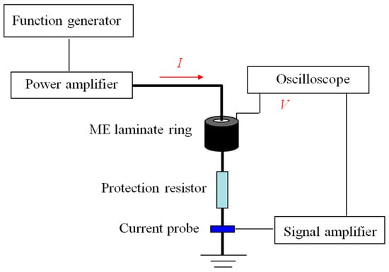 To verify the new method, a sample of the laminate ring with dimensions = 5 mm, 12.5 mm, and 3 mm was fabricated and tested in our laboratory. Terfenol-D/epoxy composites and NdFeB magnets were used to fabricate the magnetostrictive rings, and Pb(Zr,Ti)O3 was used to create the piezoelectric ring. The sandwich structure was laminated with silver-loaded epoxy and cured under high pressure at room temperature for over 24 h. The material parameters for calculation were according to the datasheet from the manufacturer and Refs. [23,24,25]. A schematic diagram of the experimental setup is shown in Figure 2. A function generator (Agilent AFG3022B) amplified by a power amplifier (AE Techron TEC7572, AE Techron, Elkhart, IN, USA) was used to generate an AC current in an electric cable to produce an AC magnetic field during testing. According to Ampere’s law, the magnetic field was not uniformly distributed in the laminate ring. The magnetic field reached the maximum or minimum value at the inner or outer radius of the ring, respectively. The waveform of the output voltage from the ME laminate ring was recorded on an oscilloscope (Tektronix DPO2014, Tektronix, OR, USA). The AC current was monitored by a current probe (Hioki 9273&3271, Hioki, Nagano, Japan). Because the magnets in the magnetostrictive rings mentioned previously provided the magnetic bias field, the external DC magnetic field was not necessary in this test. In this testing, the peak-to-peak value of the input current of the electric cable was maintained at a constant value of 1 A, and the peak-to-peak value of the corresponding output voltage of the ME laminate ring was recorded for different frequencies, which were tuned in the function generator. The ratios of and provided the measured ME voltage coefficient αV of the laminate ring. The results indicated that αV was a function of the AC-current frequency.