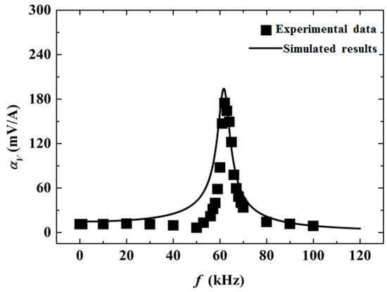 Figure 3 shows a comparison of the theoretical calculations from the generalized Hamilton’s principle and experimental measurements for the frequency response of the ME voltage coefficient of the laminate ring. The solid line represents the modeling results using Equation (14). It is shown that the ME voltage coefficient was almost constant in the low-frequency range with a value of 15 mV/A. As the frequency increased, became larger, and near the frequency of 62 kHz, it reached a value as high as 200 mV/A. With a further increase in the frequency, decreased quickly. This phenomenon is the typical resonance ME effect in ME composites. From the established model, it is shown that the ME resonance effect in the laminates was caused by vibration resonance, as the ME effect in the laminates was realized by mechanical coupling. The experimental results, shown in rectangles, showed satisfactory agreement with the theoretical results. The small discrepancy in the theoretical curve with experimental data might be introduced by the following factors. First, as shown in Figure 1, an ideal model where the magnetostrictive rings were assumed as homogeneous materials without considering the permanent magnets was established for the ME laminate ring. Next, a perfect bonding between the layers was assumed, implying that the strain of the magnetostrictive materials transferred to the piezoelectric material without loss. In fact, the unpredictable stress and strain introduced by the elasticity and viscosity of the bonding materials may have decreased the strain transfer efficiency and significantly affected the errors between the model and experiment [14,15,16]. Subsequently, an axisymmetric deformation was assumed in the theory where only the normal strain was considered and the shear strain was neglected. However, overall, the generalized Hamilton’s principle provides a convenient and effective method to analyze the ME effect in the ME laminate ring.