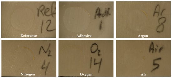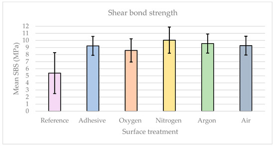 The results of the shear bond strength test revealed values of 5.38 MPa (±2.90), 9.23 MPa (±1.34), 8.59 MPa (±1.64), 10.04 MPa (±1.84), 9.56 MPa (±1.35), and 9.27 MPa (±1.33) for groups nreference = 20, nadhesive = 20, noxygen = 20, nnitrogen = 20, nargon = 20, and nair = 20, respectively. The values of adhesive- and plasma-treated groups were significantly different from that of the reference group (p < 0.05), whereas no statistical difference was encountered between the adhesive and plasma groups (Figure 3). The null hypotheses that there is no influence of feeding gases on the bonding strength between PEEK and veneering composites had to be rejected.