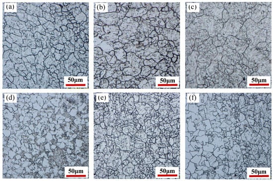 Microstructure of 35CrMoV steel at different deformation temperatures and strain rates: (a) 0.01 s−1, 850 °C; (b) 0.01 s−1, 950 °C; (c) 0.01 s−1, 1050 °C; (d) 10 s−1, 850 °C; (e) 10 s−1, 950 °C; (f) 10 s−1, 1050 °C.