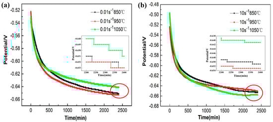 The open-circuit potential (OCP) curves of 35CrMoV steel in 3.5 wt% NaCl solution: (a) 0.01 s−1, 850–1050 °C; (b) 10 s−1, 850–1050 °C.