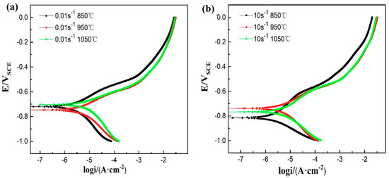 Polarization curves of 35CrMoV steel in 3.5 wt% NaCl solution: (a) 0.01 s−1, 850–1050 °C; and (b) 10 s−1, 850–1050 °C.