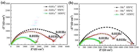 Nyquist plots of the 35CrMoV steel in 3.5 wt% NaCl solution: (a) 0.01 s−1, 850–1050 °C; (b) 10 s−1, 850–1050 °C.