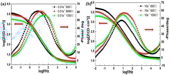 The Bode plots of 35CrMoV steel in 3.5 wt% NaCl solution: (a) 0.01 s−1, 850–1050 °C; (b) 10 s−1, 850–1050 °C.