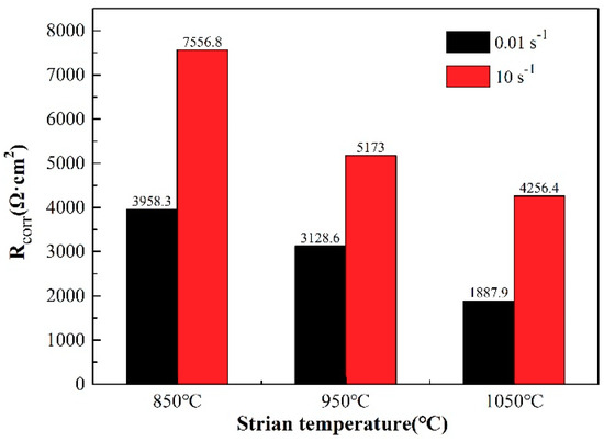 In order to further quantitatively analyze the electrochemical corrosion behavior of the 35CrMoV steel in 3.5 wt%NaCl solution, an equivalent electrical circuit (R(Q (R (QR)) is established to fit the EIS spectra, which can well-express the corrosion mechanism of the metal interface or solution. The equivalent circuit consists of two time constants [44], as shown in Figure 8. The EIS, fitted by the ZsimpWin software (Buokamp, MA, USA), and the fitting results are shown in Table 3. The five different elements used in the equivalent circuit have different physical meanings and can be divided into three different categories. The first part, Rs, is the solution resistance of the electrolyte, which is used to characterize the kinematic velocity of the chloride produced on the surface of the specimens in the electrolyte. In the second part, Qf and Rf are used to imply the capacitance and resistance of the corrosion product respectively, which can reflect the diffusion of ions in the corrosion product layer and the formation of the corrosion product on the substrate surface during electrochemical corrosion. Additionally, Rf is an important parameter used to characterize the protective effect of the oxide layer. It can be found that a larger corrosion product resistance means better protection of the oxide layer and a greater resistance to ion movement. In the third part, Qdl and Rct are used to characterize the double-layer capacitance and charge transfer resistance of the reaction interface respectively, which are related to the electrochemical corrosion reaction between the sample matrix and the electrolytic solution. Furthermore, Q (in the second and third parts) is a constant phase angle element (CPE), which describes the physical quantity when the parameter of interface capacitance, C, deviates due to dispersion effects. In general, the reactions in the second and third parts occur in the middle- and low-frequency regions of EIS, which are related to the corrosion resistance of the specimens. The corrosion resistance of the samples is evaluated by combining the corrosion product resistance Rf with the charge transfer resistance Rct (Rcorr = Rf + Rct) [1,33,35,40]. Generally, the corrosion resistance enhances as Rcorr increases. The polarization resistances (Rcorr) of the two groups of all of the samples studied are shown in Figure 9. It can be seen from Figure 9 that Rcorr decreases with an increase of 35CrMoV steel thermal deformation temperature at the same strain rate, indicating that the corrosion rate is accelerated. This is because an increase in the 35CrMoV hot deformation temperature is conducive to grain growth, resulting in a coarse grain size and lower corrosion resistance. At the same temperature, Rcorr increases with an increase in the strain rate and, more importantly, the highest Rcorr appears at 10 s−1 and 850 °C, indicating that the fine grains obtained at high strain rates and low deformation temperatures can make the oxide layer denser and improve the corrosion resistance.