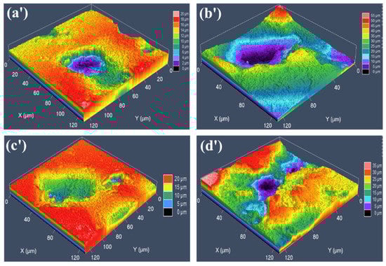 Three-dimensional corrosion morphology of the 35CrMoV steel: (a′) 0.01 s−1, 850 °C; (b′) 0.01 s−1, 1050 °C; (c′) 10 s−1, 850 °C; (d′) 10 s−1, 1050 °C.