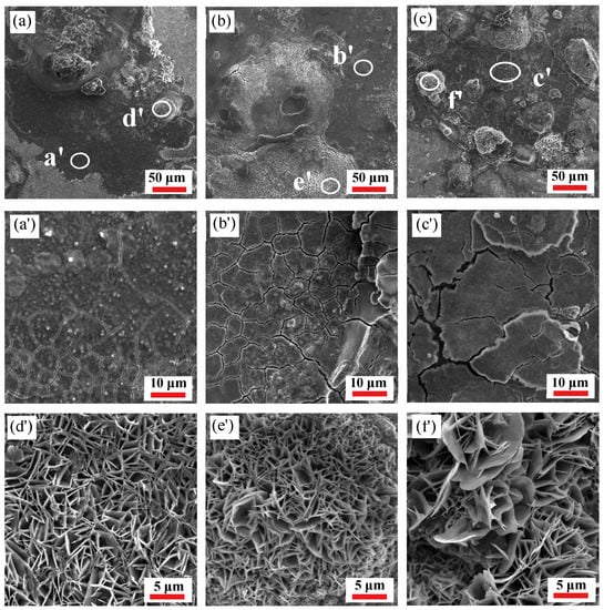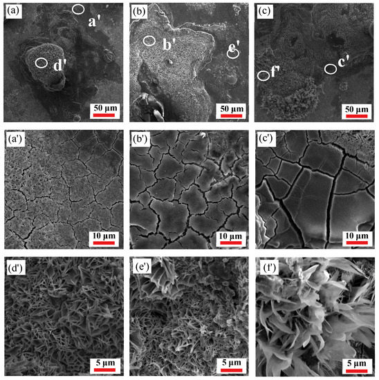 Figure 12 and Figure 13 show the surface morphology of the specimens after polarization in 3.5 wt% NaCl solution. It can be observed from Figures (a), (b), and (c) in Figure 12 and Figure 13 that there are cracks and platelet crystal-like corrosion product films on the surface of the specimens. At the same strain rate, the surface corrosion product-coverage area increases and the corrosion product accumulates with an increase of the deformation temperature. However, at the same deformation temperature, the accumulation of corrosion products decreases because of an increase in the strain rate, indicating that the corrosion degree is weakened. The cracks on the corroded surface are displayed in Figure 12 and in Figure 13a′–c′, and are due to dehydration after the sample immersion test [45]. The corrosion cracks are formed at the initial stage of corrosion which, with an increase of temperature, become wider, deeper, and looser at the same strain rate, and the corrosion products fall off slightly, indicating that corrosion is deepening. However, at the same deformation temperature, the corrosion cracks on the surface of the specimens become narrower, shallower, denser, and less detached as the strain rate increases, indicating that the corrosion rate is weakened. The platelet-like corrosion products (Figure 12 and Figure 13d′–f′) generated on the surface are due to the deepening of the surface corrosion, resulting in rust being generated and the corrosion products accumulating. In other words, with an increase of deformation temperature, the gap in platelet corrosion products becomes wider and looser at the same strain rate, which is more likely to cause oxidative corrosion on the surface, favorable to the further invasion of the corrosive medium which accelerates the corrosion. Furthermore, an increase of the deformation temperature is beneficial to grain growth, which then affects the corrosion rate at the same strain rate. Additionally, the cracks are narrower and the platelet-corrosion product film is densified and uniform at the same deformation temperature, due to strain rate increases. The deformation process becomes rapid, the dynamic recovery rate decreases, and the re-crystallized grains have not yet fully grown, resulting in smaller grains.