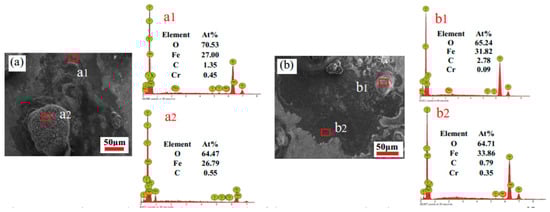 Corrosion morphology and energy disperse spectroscopy (EDS) analysis of the 35CrMoV steel at the same temperature (850 °C) and at different strain rates: (a) 0.01 s−1; and (b) 10 s−1.