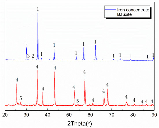 X-ray diffraction patterns of iron concentrate and bauxite (1-Fe3O4, 2-Fe2O3, 3-Diopside, 4-Al2O3, 5-TiO2).
