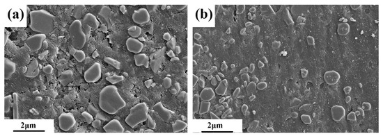 In sample B1, the cooling rate of the metal droplets is relatively fast due to the smaller heat capacity of the micro-area environment around the metal droplet. It is well known that at large cooling rates, thermal stress caused by temperature gradients induces the occurrence of dislocations. This conclusion is consistent with many published studies [30,31,32]. According to the dislocation model [33], the low-angle grain boundary can be regarded as consisting of a large number of dislocations. Therefore, the stress of the iron particles in the sample is mainly due to the thermal stress caused by the undercooling, and the larger stress causes an increase in dislocations in the iron particles. On the basis of the solidification principle, a large number of dislocations cause hardening of the metal, thereby affecting its plastic deformation. In this study, the low-angle grain boundary weakens the reinforcing effect of the metal phase in the composite material.