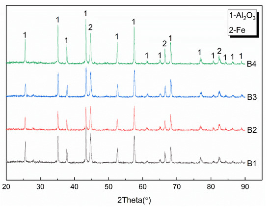 In order to determine the phase composition of composites, XRD analysis was carried out on the samples. Figure 3 shows the XRD patterns of samples sintered at 1380 °C with different bauxite additions. Samples B1, B2, B3, and B4 are displayed in order from bottom to top. As shown in the figure, diffraction peaks of only Al2O3 and Fe were found in all four samples. This indicated that the reduction reaction can be carried out completely at a sintering temperature of 1380 °C. In addition, no diffraction peaks related to TiO2 which is contained in the bauxite were found in the XRD patterns. The reason for this phenomenon is that TiO2 combined with the oxides such as SiO2, CaO to form a liquid phase at high temperature. During the cooling process, this liquid phase solidifies and forms a glass phase. The oxides such as SiO2, CaO, and TiO2 in raw minerals are not harmful substances in the process of materials preparation. On the contrary, they can be used as good sintering aids to effectively promote the sintering of the composites, reduce the sintering temperature, and reduce the porosity [7].