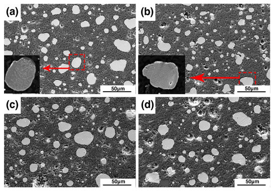Figure 4 shows the microstructure of samples B1–B4 after sintering at 1380 °C. The white particles are metallic iron, and the black region consists of alumina matrix and glass phases. The iron particles in the four samples are circular or oval. The reason for this phenomenon is that the carbon content in the sample is excessive, and the iron carburizes with the remaining carbon. As the amount of carburization increases, the melting point of the Fe-C alloy gradually decreases. At the same sintering temperature, the lower the melting point, the lower is the viscosity of the liquid phase. Thus, the metal particles in the sample gradually became circular.
