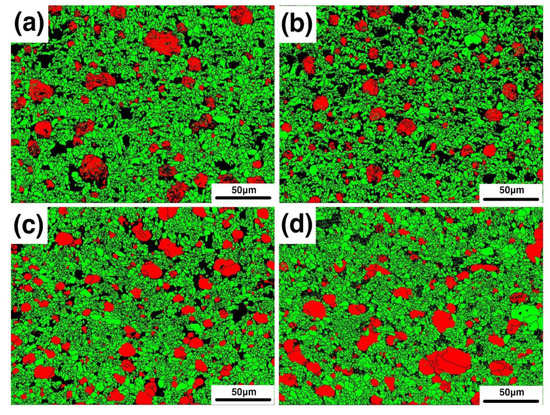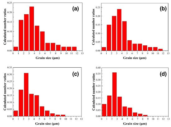Alumina grain size distribution map of samples B1 (a), B2 (b), B3 (c), and B4 (d).