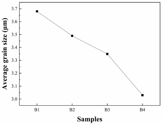 Alumina is derived from pure alumina and bauxite, and the alumina particles in the bauxite are finer. Therefore, with the increase of bauxite content, the small size alumina grains in the sample gradually increased. The alumina grain size of the four samples was statistically analyzed to quantitatively analyze the size of the alumina grains. Figure 5a–d shows the alumina grain size distribution of samples B1, B2, B3, and B4, respectively. In sample B1, the grain size is mainly between 1.5 μm and 5.5 μm, and the grain proportion of 3.5 μm was the largest. Compared with sample B1, sample B2 has a reduced content of large-size grains. The alumina grains of sample B3 were mainly distributed between 1.5 μm and 4.5 μm, with the highest proportion of 2.5 μm. The ratio of large-size alumina grain size of sample B4 was even lower, and that of 2.5 μm size is about 35%. Figure 6 shows the average size of alumina grains in the four samples. With the increase of bauxite, the average particle size of alumina decreased from 3.7 μm to 3.0 μm. On the whole, the grain size of sample B3 is finer and the size distribution is more uniform, which is one of the reasons for the higher flexural strength of sample B3.