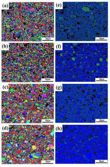 In order to analyze the second issue mentioned in the previous section, namely the grain boundaries of iron particles, EBSD analysis was performed. Figure 7a–d shows the phase distribution of samples B1, B2, B3, and B4. The red particles are the metal phase, the green crystals are the alumina phase, and the black regions are the glass phase and the uncalibrated areas. As can be seen in the figure, there are indeed a large number of grain boundaries in the iron particles. It was also found that as the amount of bauxite addition increased, the number of grain boundaries gradually decreased. The iron particles gradually changed to a single crystal or consisted of several subgrains. Figure 8a–d shows Inverse Pole Figure X-axis (IPFX) diagrams of samples B1, B2, B3, and B4, respectively, while the Figure 8e–h shows the stress distribution of the samples B1–B4. It can be seen that the orientation of the iron particles in sample B1 is disordered and random, with a large number of grain boundaries, and the stress of the iron particles is large. It was found that the grain boundary of the iron particles depends on the stress. The grain boundaries of the iron particles with high stress are numerous, and the orientation of the iron particles is also disordered. However, iron particles with small stress have no grain boundary and their orientation is uniform. With the bauxite addition increase, the orientation of the iron particles gradually becomes uniform. It is inferred that the cause of stress and grain boundaries is due to the glass phase in the sample. To confirm this point, we first analyzed the composition of the glass phase.